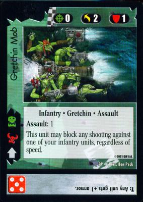 Enter the humble Gretchin. Various Gretchin cards have been printed throughout 40K CCG sets, and generally follow a flavourful design pattern of being non-flag units that either play a support role or represent Gretchin being shot/blown up/sacrificed for the benefit of the Orkz. While I’m a big fan of defensive Gretchin like Gretchin Mob, offensive scaling cards like Ammo Grotz can quickly get out of hand, especially at large sector battles.