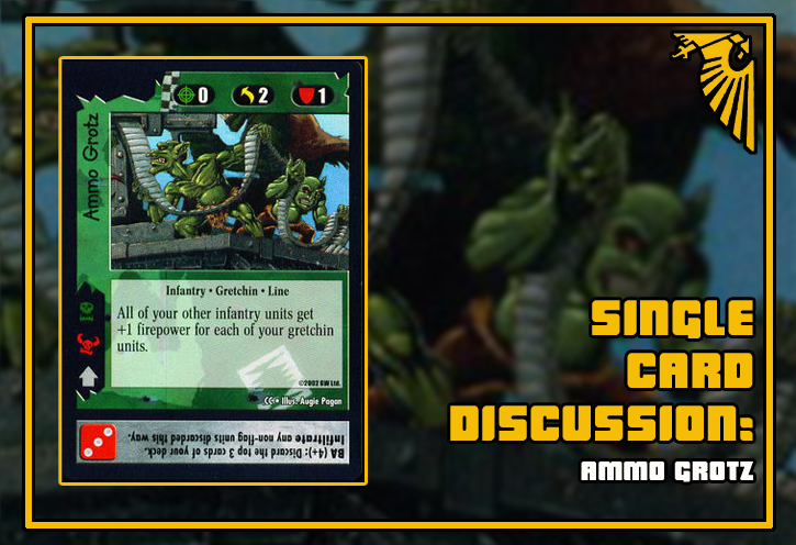 Ammo Grotz are otherwise generally useless in combat unless you have additional firepower boosters like Looted Demolisha (one more reason why multiple Ammo Grotz at a sector becomes kind of nutty) or you need a sacrificial body to protect your Gretchin Mob and its static ability. The die roll is fair but not exciting, and the command line will vary in helpfulness depending on how many non-flags you run in your deck.