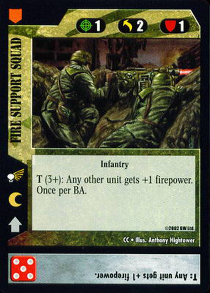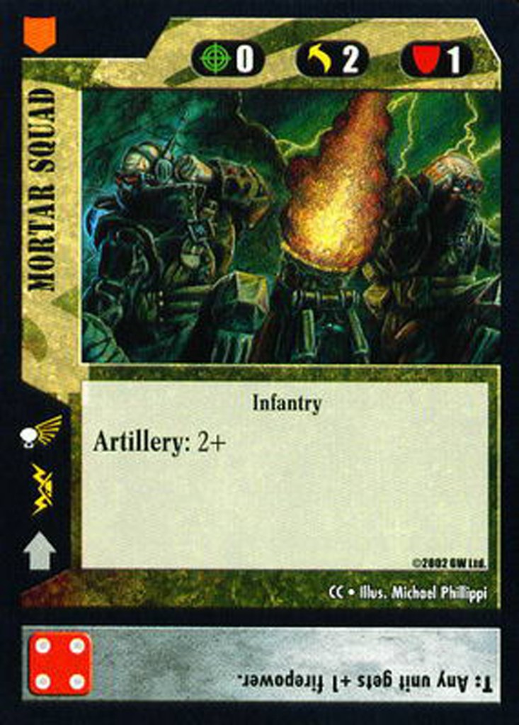 Guard have very few options to increase their dice rolls, and many of the high-die cards available are not very good (I’m looking at you, Infantry Squad). That’s why units with reliable rolls such as Basilisk (3+ artillery shell, 2+ infantry firepower boost) are so valuable. You can count on them to lift up your units at a sector without being subjected as harshly to RNG or Chaos/Eldar shenanigans.