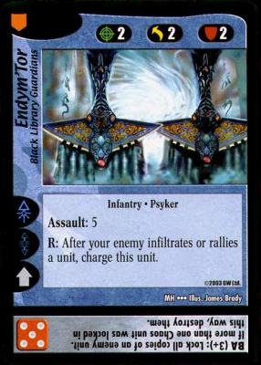 You can see similar design principles being applied to the units more so than the characters: effective on the battlefield, but even more effective against their “hated” faction. (As a side note, it would be an interesting discussion to determine whether these cards were designed more for “fluff” (for example, being introduced as anti-Xenos units like Deathwatch) or for game balance – or both.). Endym’Tor specifically stands out as a very strong unit disguised as an anti-Chaos unit.