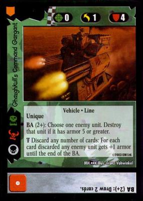 The Goffs fleet card is arguably the strongest of all the Ork fleet cards, and possibly the entire game. The amount of guaranteed card advantage you can generate is tremendous, especially if you have discard outlets to exploit the extra cards (see above for Veteran Skarboyz or below for Ghazghkull’s Command Gargant and Kannon Krooza (SCD article here)). This power is compounded by the fact that Goffs are the most prevalent Orks faction, and that many Goffs cards are best-in-class for Orks: