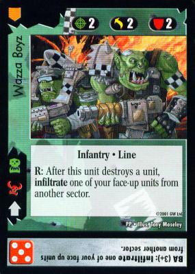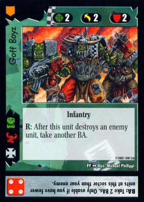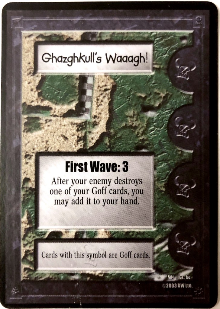 Ghazkull’s Waaagh is definitely a powerful fleet card. I have to be extra careful with my kill order against Goff units, because most Goff cards have command lines that are useful. For example, killing a Rok Thumper early means the Ork player will be guaranteed an armour boosting tactic, or killing a Kannon Krooza means losing a charging unit in the future. By the way, both of those units are all-stars.