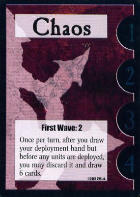 I use the Chaos fleet card ability to replace deployment hands that have too many weak units with good rolls or command lines like Juggernauts of Khorne, Black Horsemen (unless blocking is needed), and Renegade Space Marines. I should be running Great Unclean Ones with all the roll modification I have. I tried Chaos Land Raiders for three games, but I was not impressed with them; I do not think I have enough infantry assault units. I want to like Chaos Bikes or Raptors more. One weakness revealed by my games with Derfington is the low playability of most command hands. Also, the superior survivability of loyalist Space Marines is enviable.