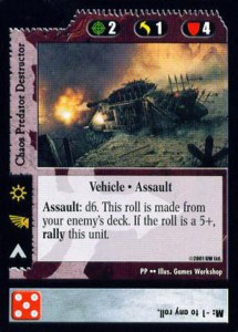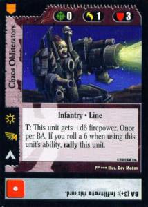 I removed the singleton cards in my original deck and added Tzeentch Flamers, Bunker Complexes, and Chaos Obliterators. The deck is balanced between shooting and assaulting. It is designed to punish the opponent’s rolls, and leverage reactions to rally, charge, or infiltrate, shoot with Chaos Space Marines, and protect them with a few high-speed blockers. During deployment I want to setup combos like Bunker Complex and Tzeentch Flamers (for reaction charging) and/or Chaos Space Marines/Perdition’s Fury/Plague Marine Terminators to shut down enemy shooting. There is nothing wrong with doubling up on the Bunker Complex to force a second roll to shoot.