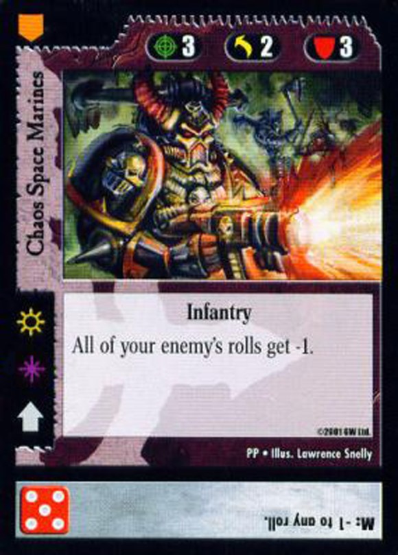Chaos Space Marines: Space Marine stats, die roll 5, and -1 to enemy rolls as both a static ability and command line. That’s it, that’s the unit review.