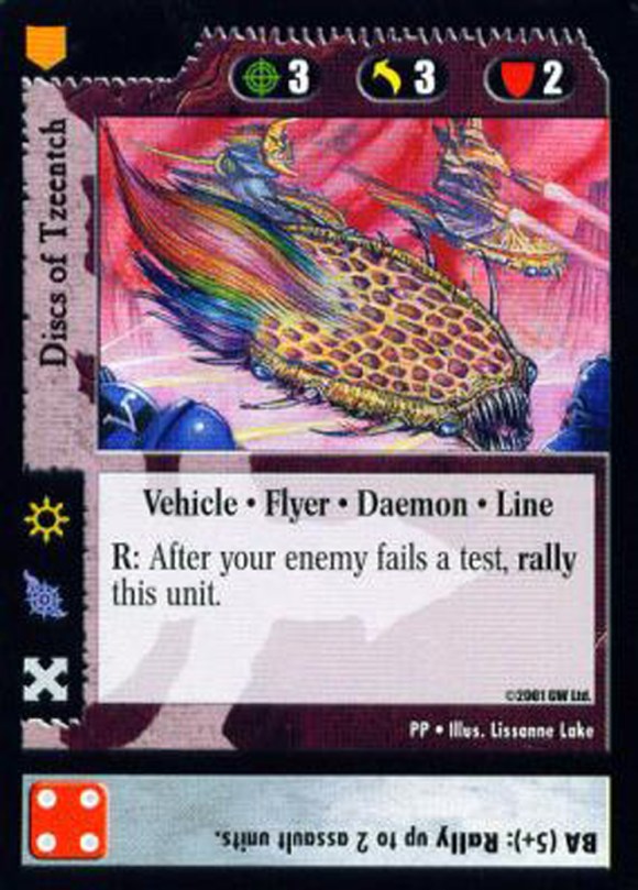 Discs of Tzeentch: What if a Predator drone swore allegiance to Tzeentch? It would be a high firepower, high speed unit with a chance to rally when opponent fails a test. Squad Faustus and their ilk will never be safe from the Discs of Tzeentch!