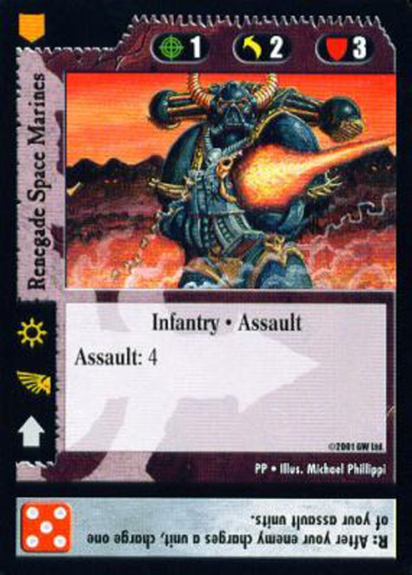 Renegade Space Marines: 1/2/3 with Assault 4 is okay on the battlefield, but their die roll of 5 and fantastic command line seal the deal. Being able to charge a unit in response to an opponent’s charge means no blocker can protect an Avatar/Vindicator/Greater Daemon from a spoiling assault. Also, it works on locked units, so the command can be saved until late in the battle against assault decks for maximum efficiency.