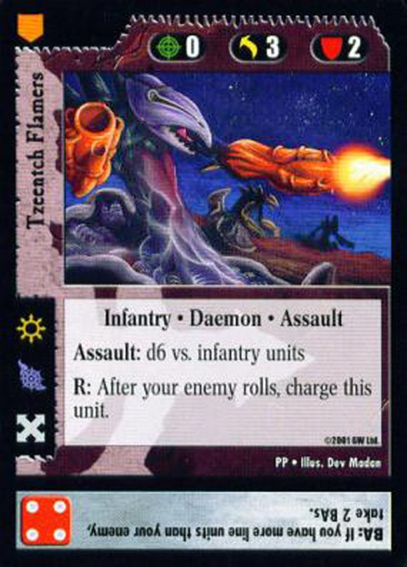Tzeentch Flamers: this game has a lot of rolling, so a unit that self-charges on enemy rolls is amazing. It is even better when you force your opponent to roll, like for invulnerable saves, armour saves, Bunker Complex, or even Great Unclean One. Assault D6 against infantry is good in a deck that can consistently roll 3+, and vehicles can be dispatched unexpectedly with the Juggernauts of Khorne’s command line.