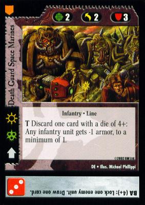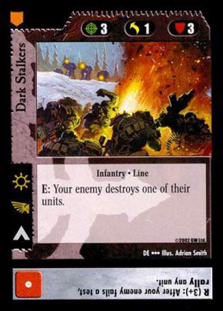Dark Stalkers: 3/1/3 with an event that destroys an enemy unit presents a tempting 2-for-1 card advantage. Their die roll of 1 and speed 1 probably gets them blocked by units real Devastator Squad units would be able to blast through.