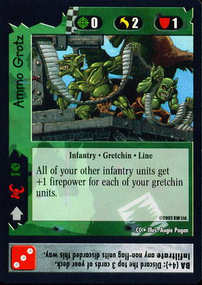 We have a handful of higher speed units to block shooting attacks (and some infantry/vehicle hybrid units to take advantage of firepower boosts), as well as 4 Gretchin Mobs to jump in the way, but by and large the deck is built on redundancy, sheer numbers, and extra BAs to pre-emptively kill your opponent’s biggest threats. Plus, due to the fleet ability, the more units that die on your side, the more cards you’ll have to boost firepower or dice rolls (or Kannon Krooza and Ghazghkull’s Command Gargant).