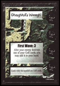 I started collecting Orks when I bought a couple 40K CCG decks off eBay several years ago. I originally built the deck as a generic Orks list, but I switched over to the Ghazghkull’s Waaagh! fleet card a few months ago and haven’t looked back.