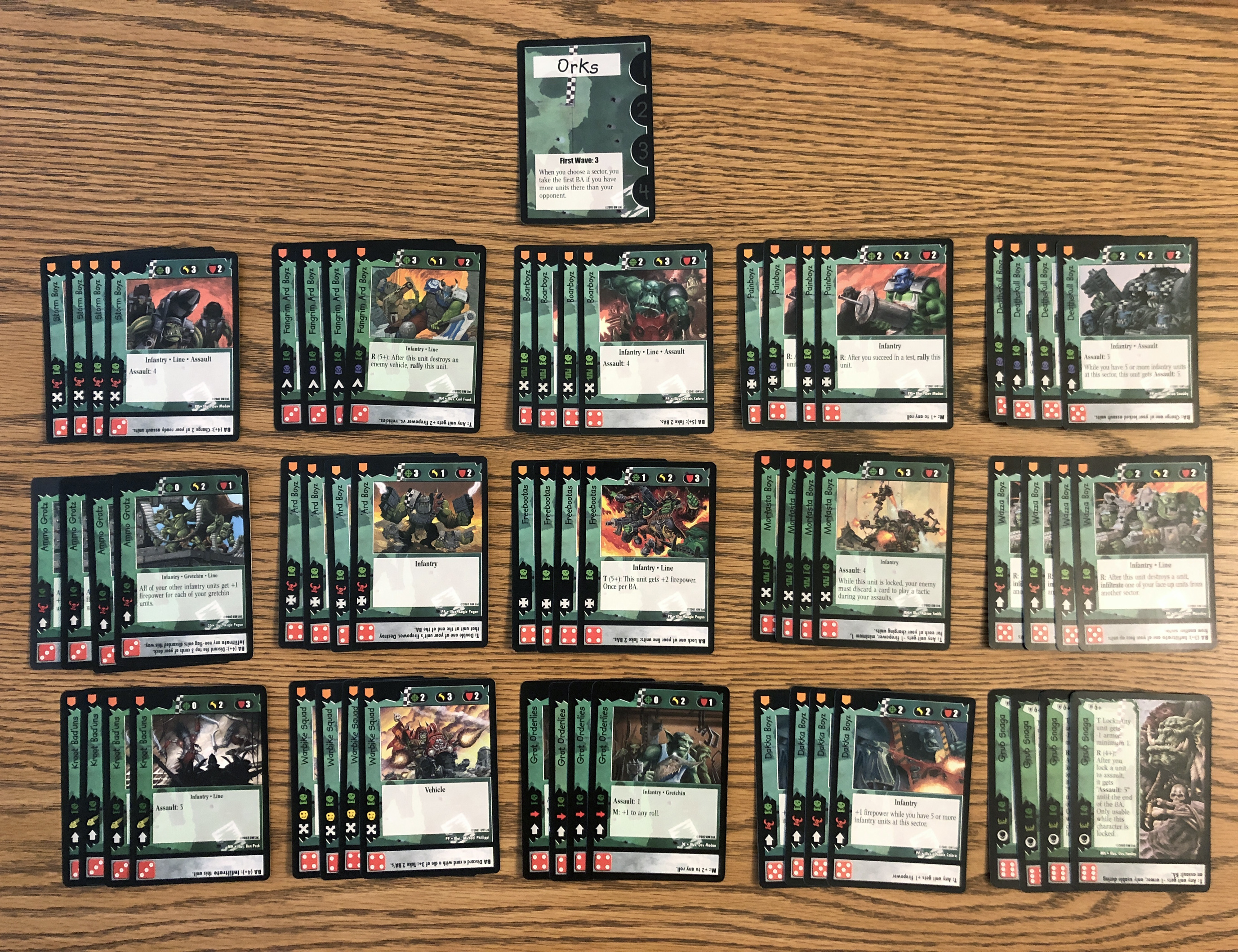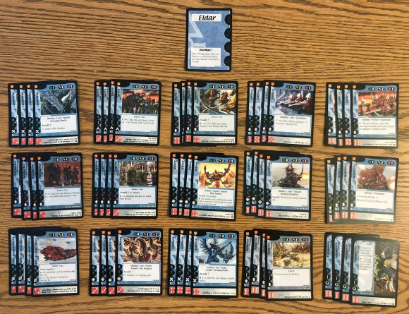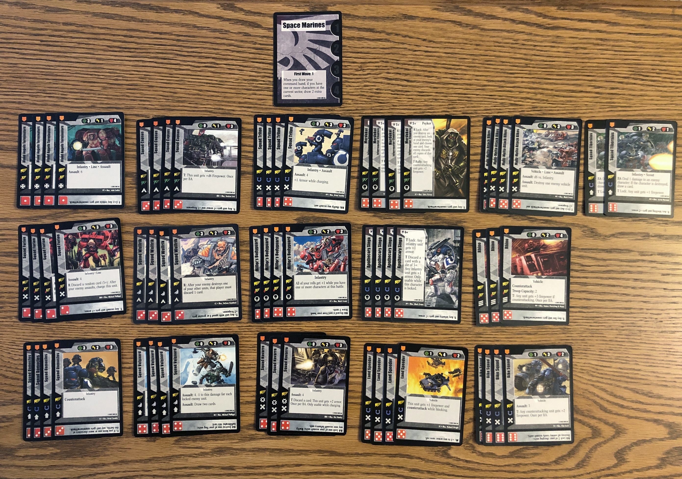 Last month, I got some interest on Facebook to share some common-only 40K CCG deck lists for a quick and easy way to get started with playing. I’m always up for a deckbuilding challenge, so after digging through my card box, I built the following Pauper lists for Space Marines, Orks, Eldar, and Chaos.