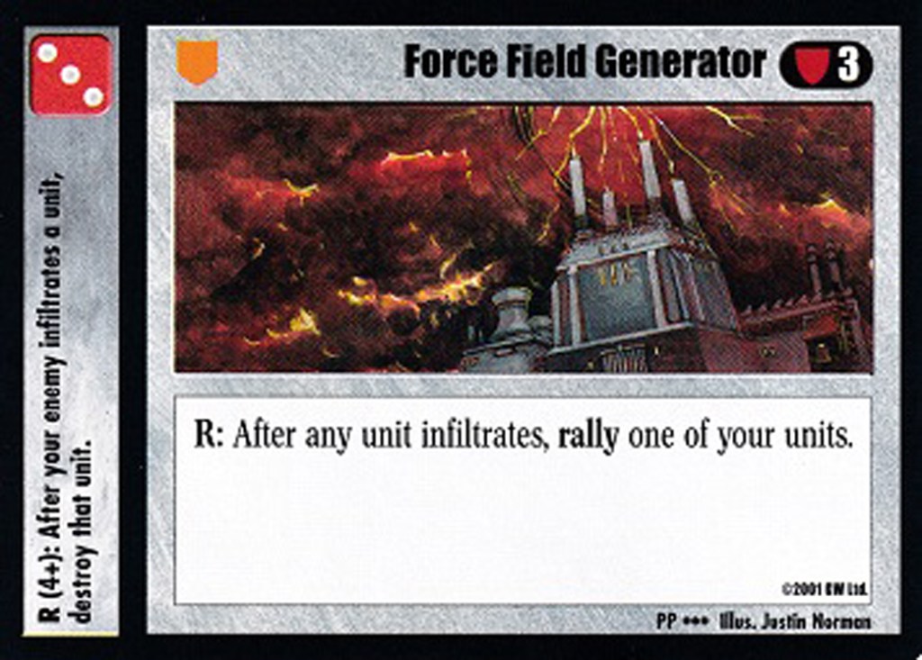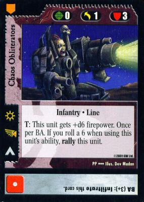 To this end I drew inspiration from Chris Berger, who developed a gimmick combo deck for Dark Eldar a few years ago. Victory would be assured if the Dark Eldar player could pull off the combo, but ignominious defeat awaited the smallest misstep. The essence of Berger’s deck was to conscript as many dual infantry-vehicle units to improve the odds of Manufacturing Facility infiltrating a steady stream of troops and tanks. Force Field Generator would rally units after every successful infiltration. After infiltrating a dozen or two units, the highly mobile Dark Eldar could easily redeploy spare troops to they could other sectors. The problem with Berger’s ploy was that at least half of the deck were fragile units. If one does not draw the right cards or the key components are destroyed early on, then the Dark Eldar player would be left with an army of weaklings. In comparison, a Bile-focused Chaos deck could still put up a fight even if the good doctor himself were not present at every battle.