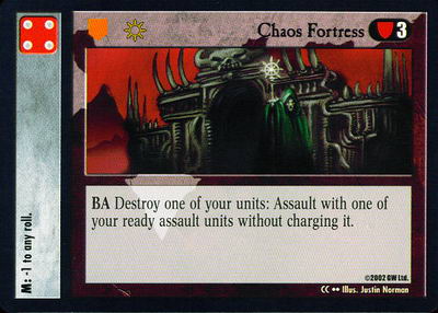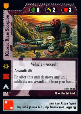 - Use Chaos Fortress to sacrifice a Khorne Brass Scorpion to immediately assault with an unlocked one. If Khorne Brass Scorpion kills a unit with its d6 assault, it reacts to infiltrate the recently deceased Khorne Brass Scorpion.