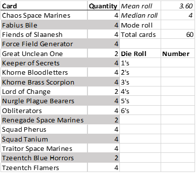 I strongly prefer the vanilla Chaos fleet card because it allows me to redraw my deployment hand, which means I am almost assured to pick up Bile most turns and avoid deployment hands full of greater daemons. The sub-faction balance is too divided to make much use of the Slaanesh or Tzeentch fleet cards anyway. The deck prioritizes Fabius Bile combos, infiltrators, assault units, and daemons.