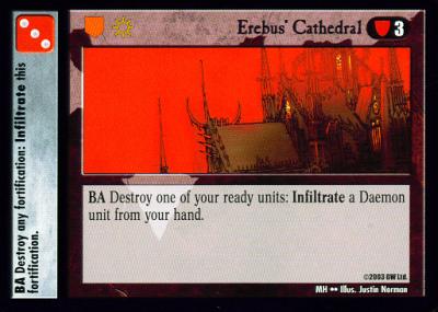 - Use Erebus’ Cathedral to sacrifice a ready daemon to infiltrate the other daemon in your hand. Force Field Generator reacts to rally another unit.