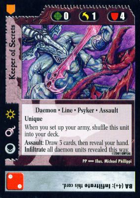 - Use Chaos Fortress to sacrifice another daemon to immediately assault with the Keeper of Secrets. The Keeper of Secrets draws you three cards, and then you infiltrate all daemons in your command hand, of which one is guaranteed. Force Field Generator reacts, rallying your Keeper of Secrets.