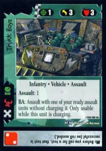 This list is highly focused on shooting, with some minor assault support from Storm Boyz-type units. I opted not to use Ammo Grotz or Looted Demolisha because I didn’t think the deck used enough infantry units – and plus, I wanted a more “fluffy” take on Kult of Speed that required the usual suspects in my other Ork decks.